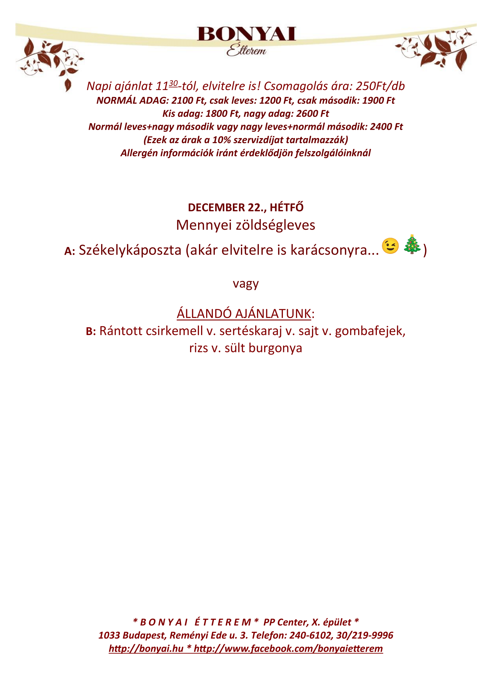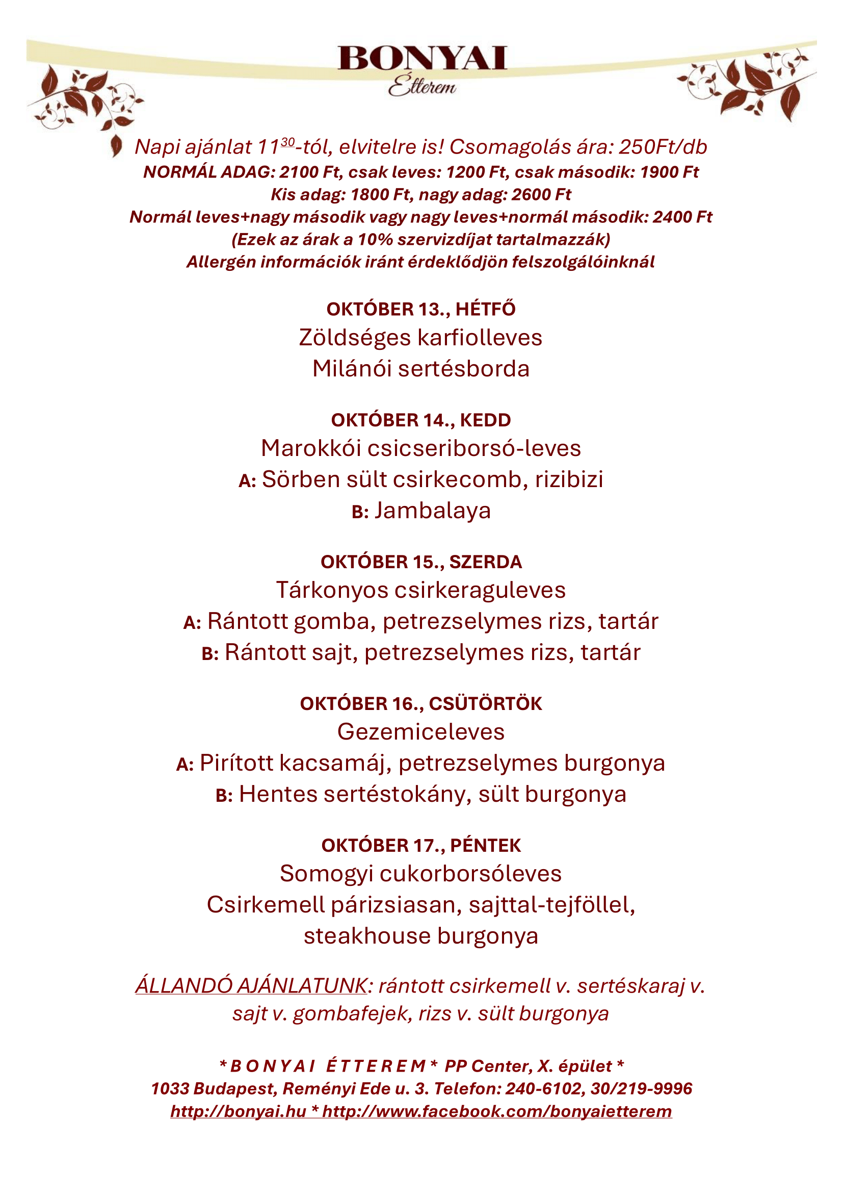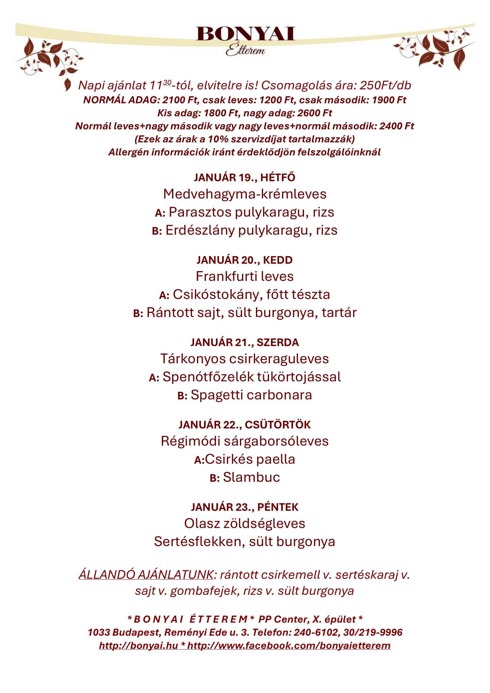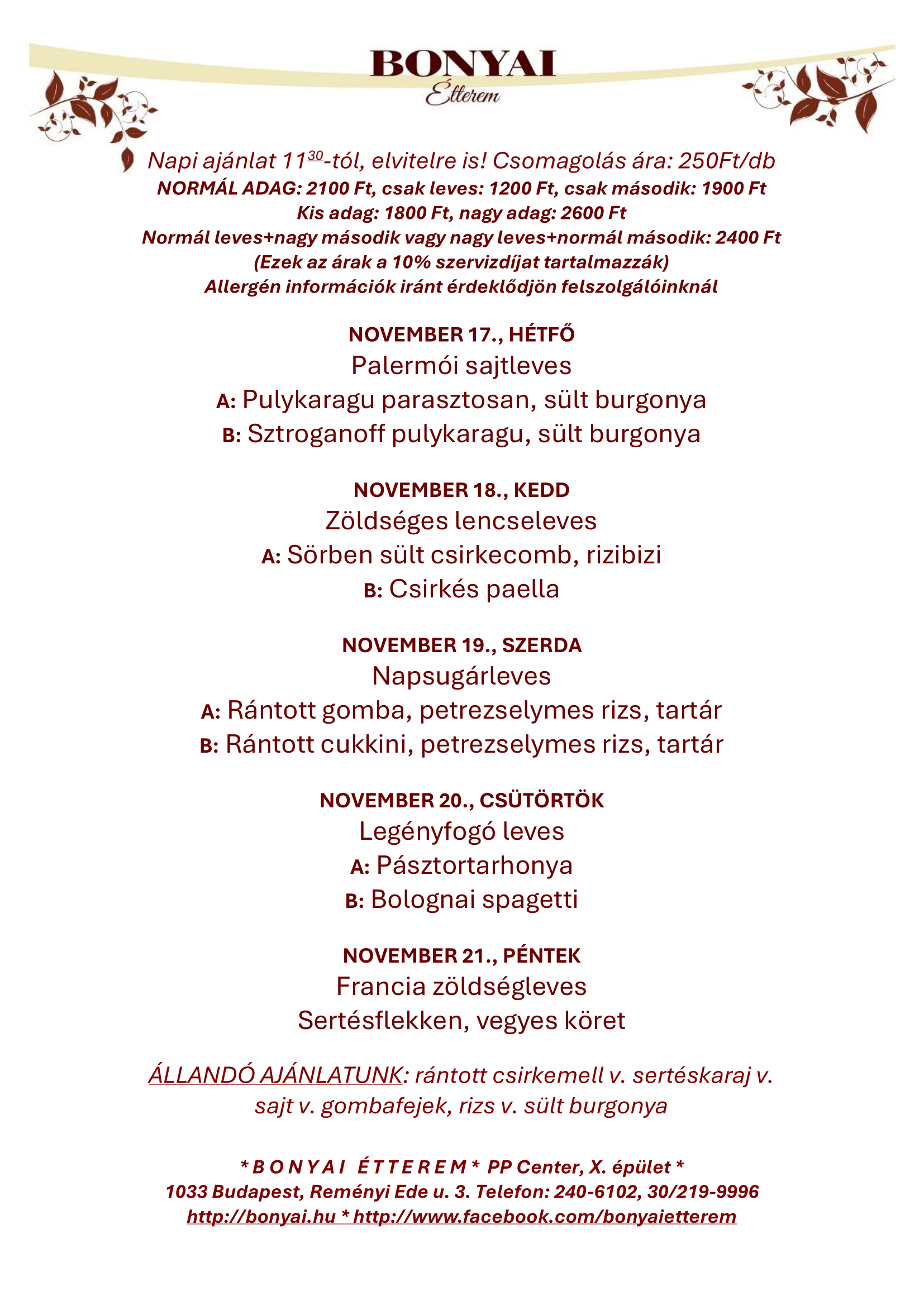 Elégedettségük érdekében minden tőlünk telhetőt megteszünk, azonban kedves vendégeink észrevételeit is szívesen vesszük. Amennyiben bármiféle javaslata, észrevétele van, melynek segítségével kínálatunkat és szolgáltatásainkat véleménye szerint még jobbá tehetjük, azt szíveskedjen jelezni az etterem@bonyai.hu e-mail címen vagy felszolgálóinknál.